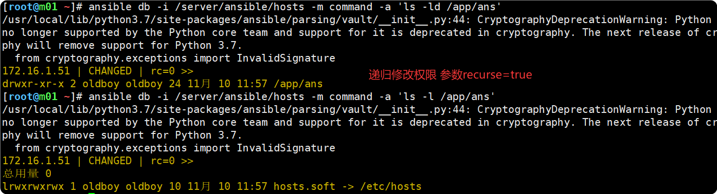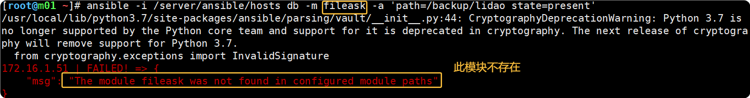 [root@m01 ~]# ansible -i /server/ansible/hosts db -m command -a 'touch {01..03}.txt'