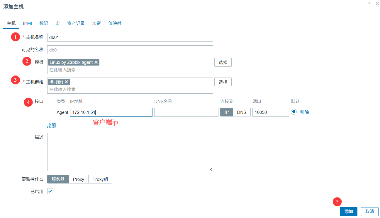 - 服务端:web页面: 创建主机,关联模板,客户端ip,启动主机